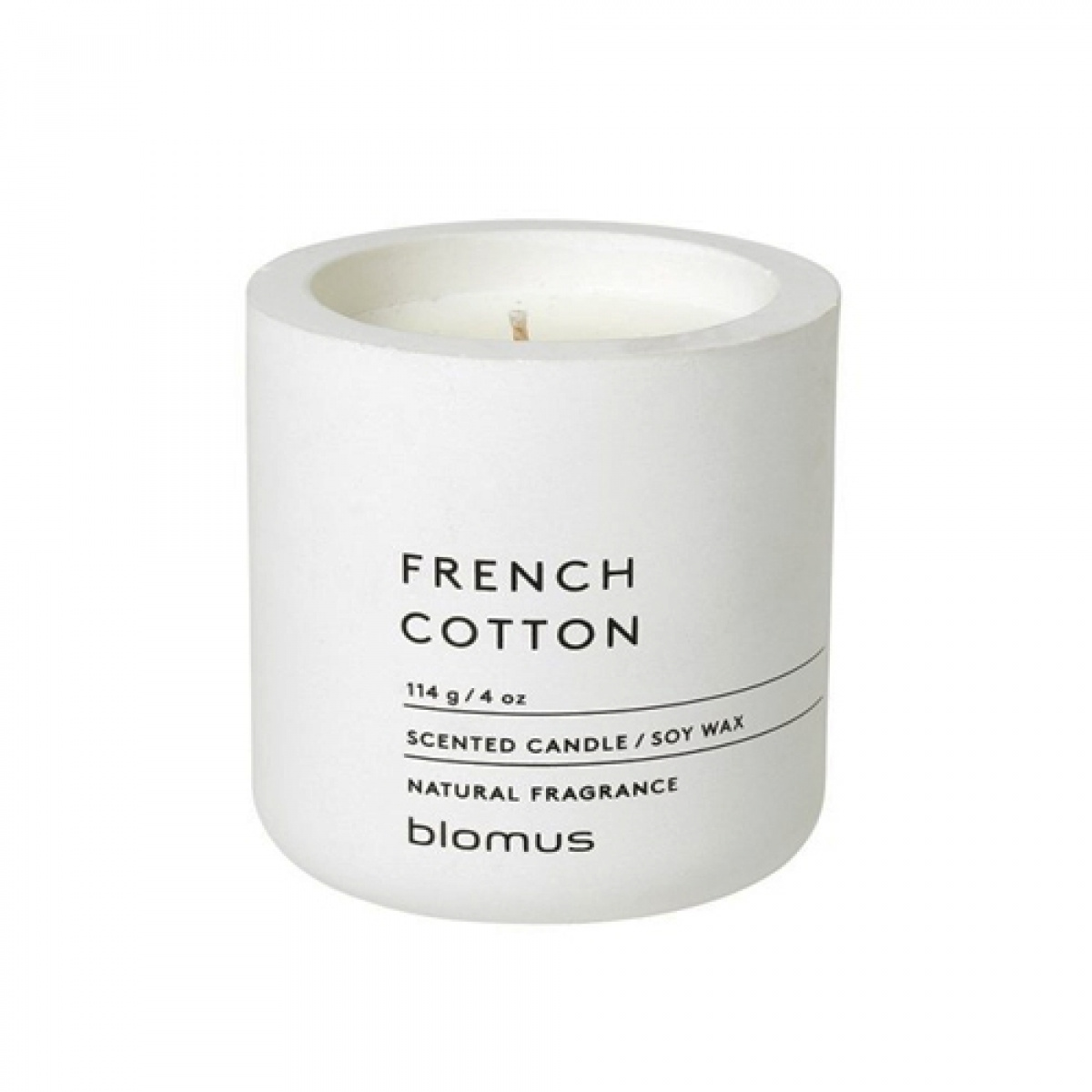 "Blomuksen FRAGA-tuoksukynttilä, jossa on ylellinen tuoksu French Cotton fon valmistettu luonnollisesta soijavahasta ja levittää hyvän tuoksun kotiin pitkällä palamisajallaan. Lilly White -värinen kynttilänjalka on betonia. Tuoksukynttilä ei sisällä palmuöljyä ja on ympäristöystävällinen."