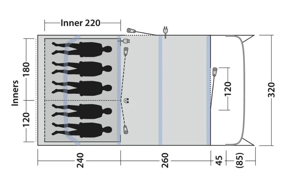Teltta sopii viidelle henkilölle kahdessa tummassa makuuhuoneessa ja tarjoaa mukavaa majoitusta perheiden seikkailuihin. Ilmanvaihto mesh-paneelien ja ylimääräisen sivuoven kautta varmistaa raikkaan ilman ja joustavat käyttömahdollisuudet. Vaalean, lämpimän sävyinen ulkokatto luo miellyttävän sisätilan tunnelman.