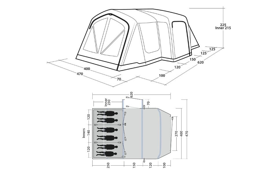 Teltta sisältää kokonsaumatun, vedenpitävän lattian, joka pitää kosteuden ja lian ulkona. Esimuotoillut ilmakanavat antavat hyvän seisomakorkeuden ja ilmavan tunteen niin makuuhuoneissa kuin oleskelutilassakin. Rigid Air Systemillä teltta pumpataan nopeasti ja helposti ulkotelttaan sijoitettujen venttiilien kautta.
