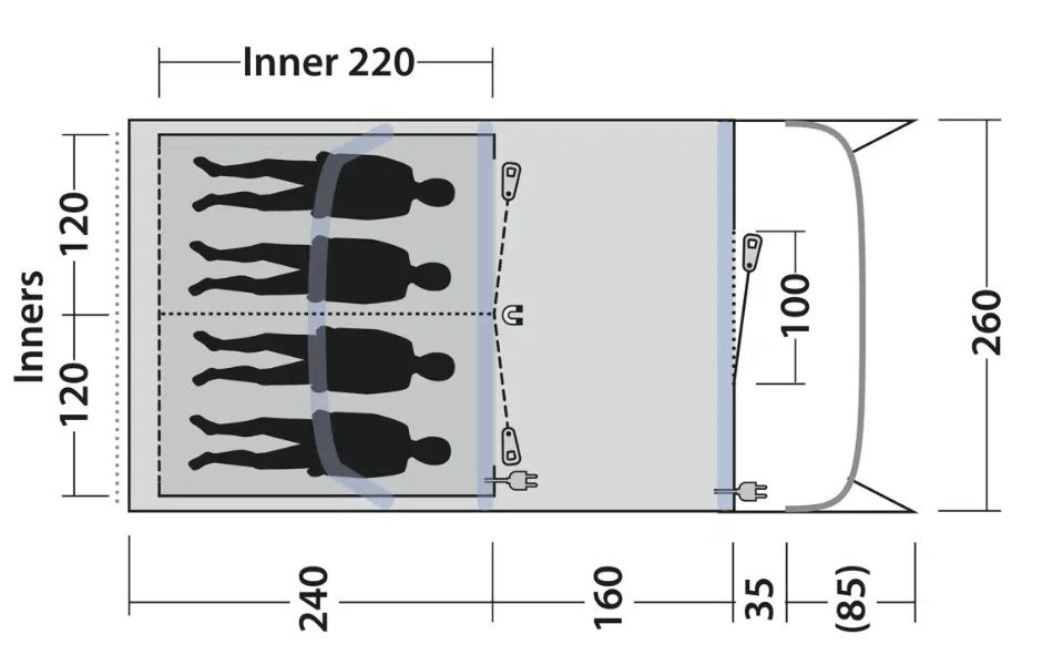 Teltta sopii neljälle henkilölle ja on ihanteellinen pienille perheille tai ensimmäiselle telttareissulle pienten lasten kanssa. Ilmanvaihto tapahtuu etuikkunoiden yläosasta ja takaa sekä syvän terassin suojatun ilmanvaihdon kautta, mikä varmistaa optimaalisen ilmankierron. Terassin joustavat taitettavat sivut tarjoavat monipuolisia suojausvaihtoehtoja.