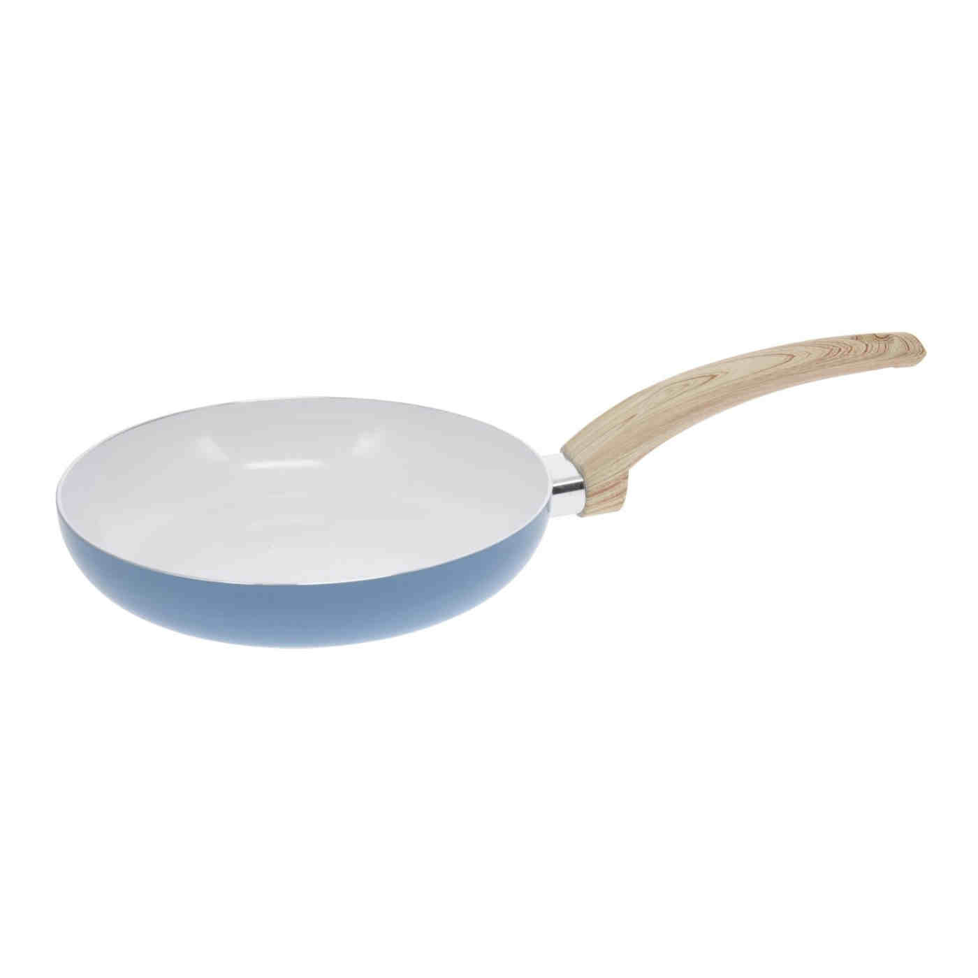 Halkaisija: 20 cm Korkeus: 4 cm Pituus kahvoineen: 37,5 cm Väri: Valkoinen sisäpuoli ja sininen ulkopuoli Materiaali: Puristettua alumiinia ja keraaminen pinnoite Astianpesukone: Ei
