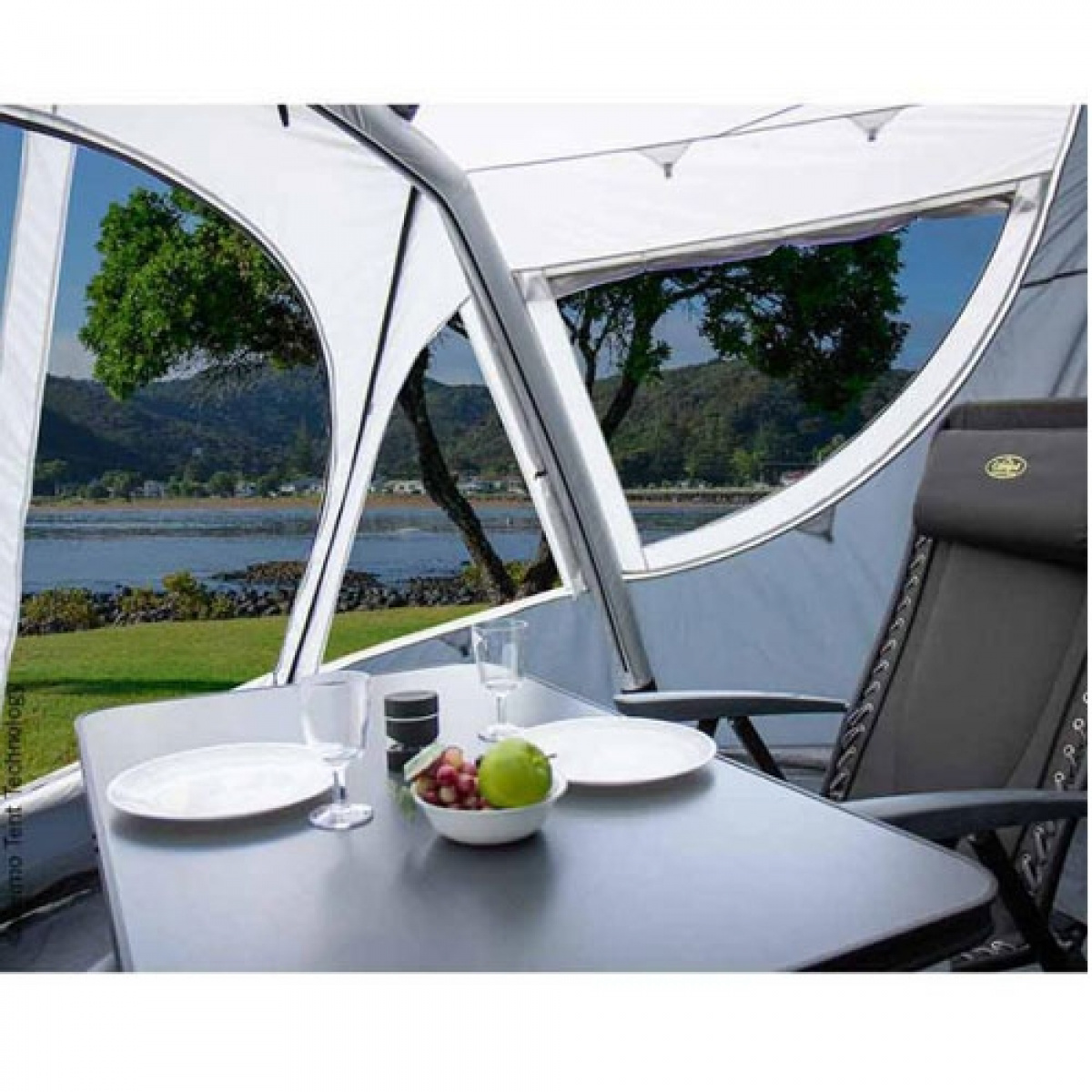Nopea ja helppo asentaa täyttämällä ilmaputki. Teltta sopii täydellisesti Adria Actionin ulkoseinän käyrään. Sivuikkuna, jossa on hyttysverkko ja vierintäsuoja, etuovi voidaan rullata ylös tai käyttää markiisina. Varustettu irrotettavalla pohjalla ja helma kankaalla.