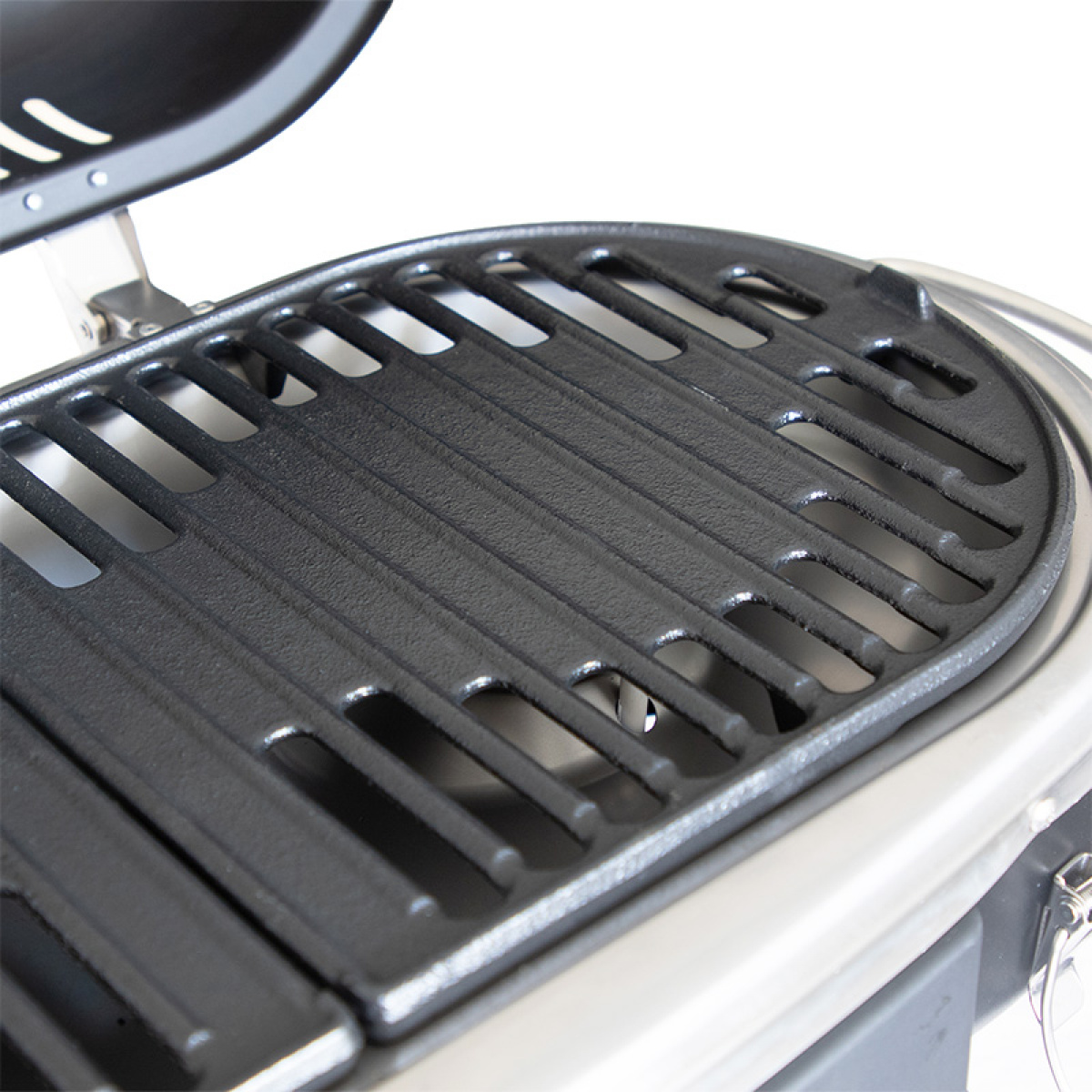 Kaasugrillissä on pietsosytytin, kaksi poltinta ja kaksi valuraudasta valmistettua grilliritilää täydellisen grillaus/paistopinnan aikaansaamiseksi. Grillissä on avattava kansi, jonka sisäkorkeus on 75 mm, joka suojaa tuulelta ja toimii roiskesuojana suljettuna. Kansi, jossa on integroitu lämpömittari, auttaa myös pitämään silmällä lämpöä grillattaessa. Grilli toimii 30 mbar paineella kaasupullosta (letku ja alennusventtiili eivät sisälly toimitukseen). Liitäntä: 1/4" vasen kierre. Mukana letkun nippa 8-10 mm.
