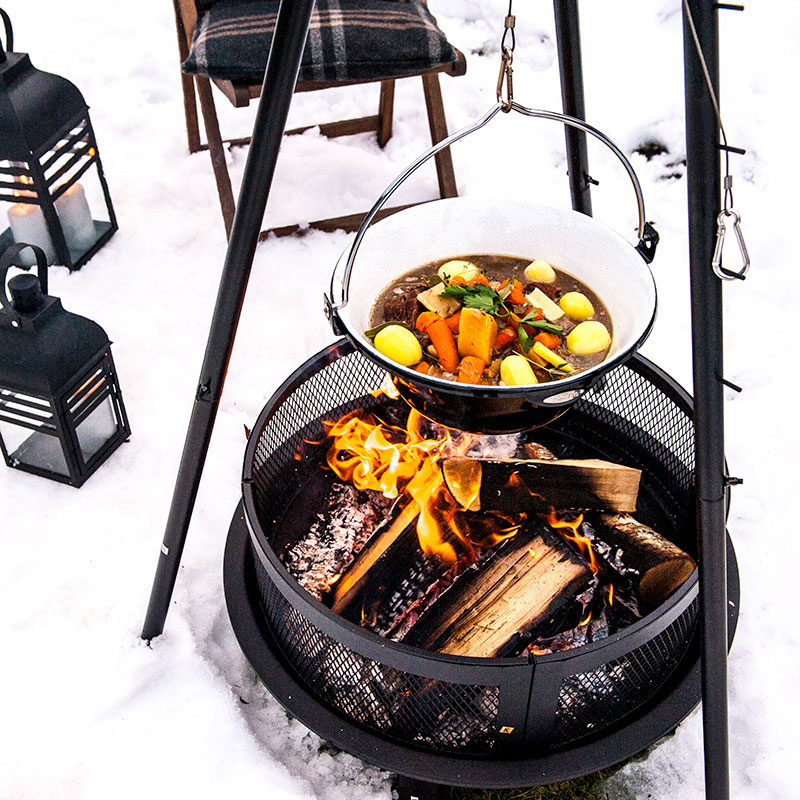 Käytä sitä miellyttävänä lämmönlähteenä tai grillaamiseen. Grilliritilä voidaan nostaa ja laskea kolmella eri tasolla. Mukana kipinäsuoja.