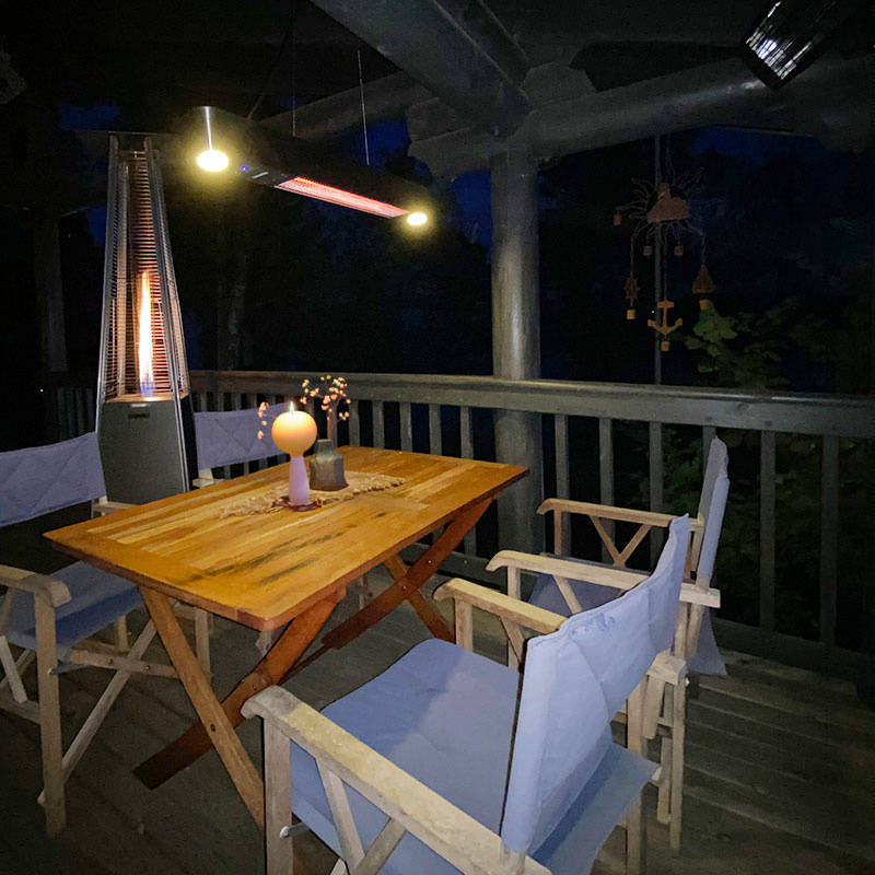 Tyylikäs sähköinen terassilämmitin kattoon asennettavaksi. Pidennä kesäiltaa kapealla terassilämmittimellä Riputtamalla terassikiukaan keskelle pöytää, jokainen pöydän ympärillä istuva nauttii sen lämmöstä.