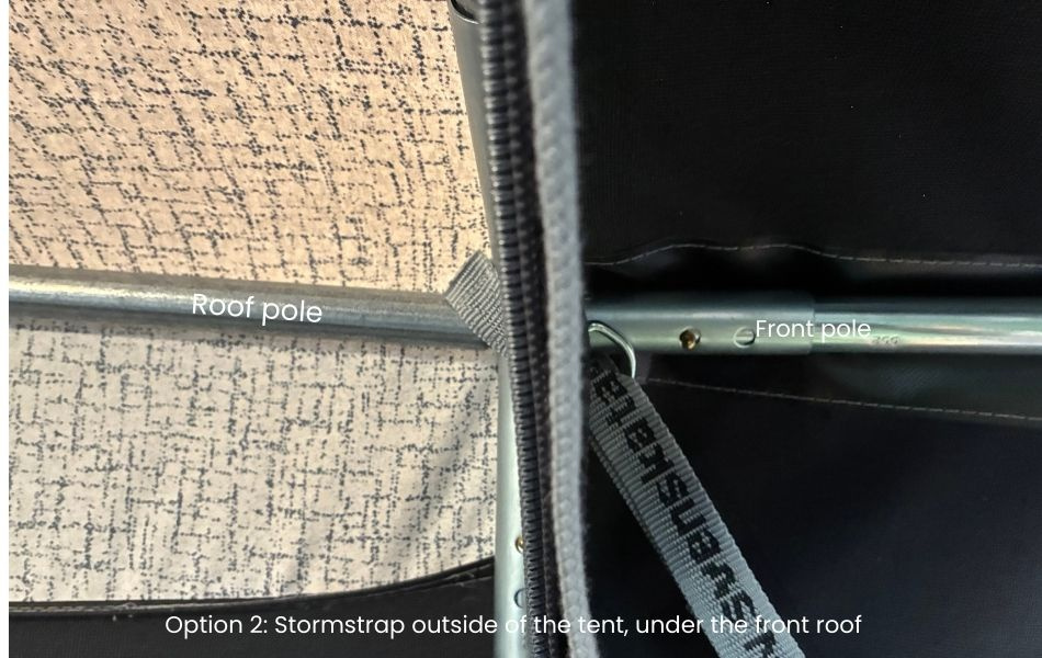 Asennusvaihtoehto 2: Katso kuva 3, katon putken ja katostangon kulmaristin ympäri, jolloin lyhyen nauhan pidike viedään reiän kautta ulospäin ja myrskynaru vedetään vinosti alas ulkokulmaa kohti. Tätä vaihtoehtoa suositellaan ensisijaisesti.