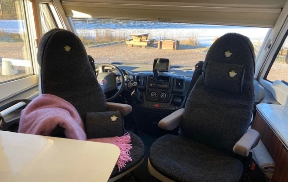 Merinovillasta valmistettu tuolityyny pehmusteella matkailuauton istuimeen. Saatavilla väreissä valkoinen, beige, harmaa, ruskea ja antrasiitti. Hinta on kahden tuolin päällisille.