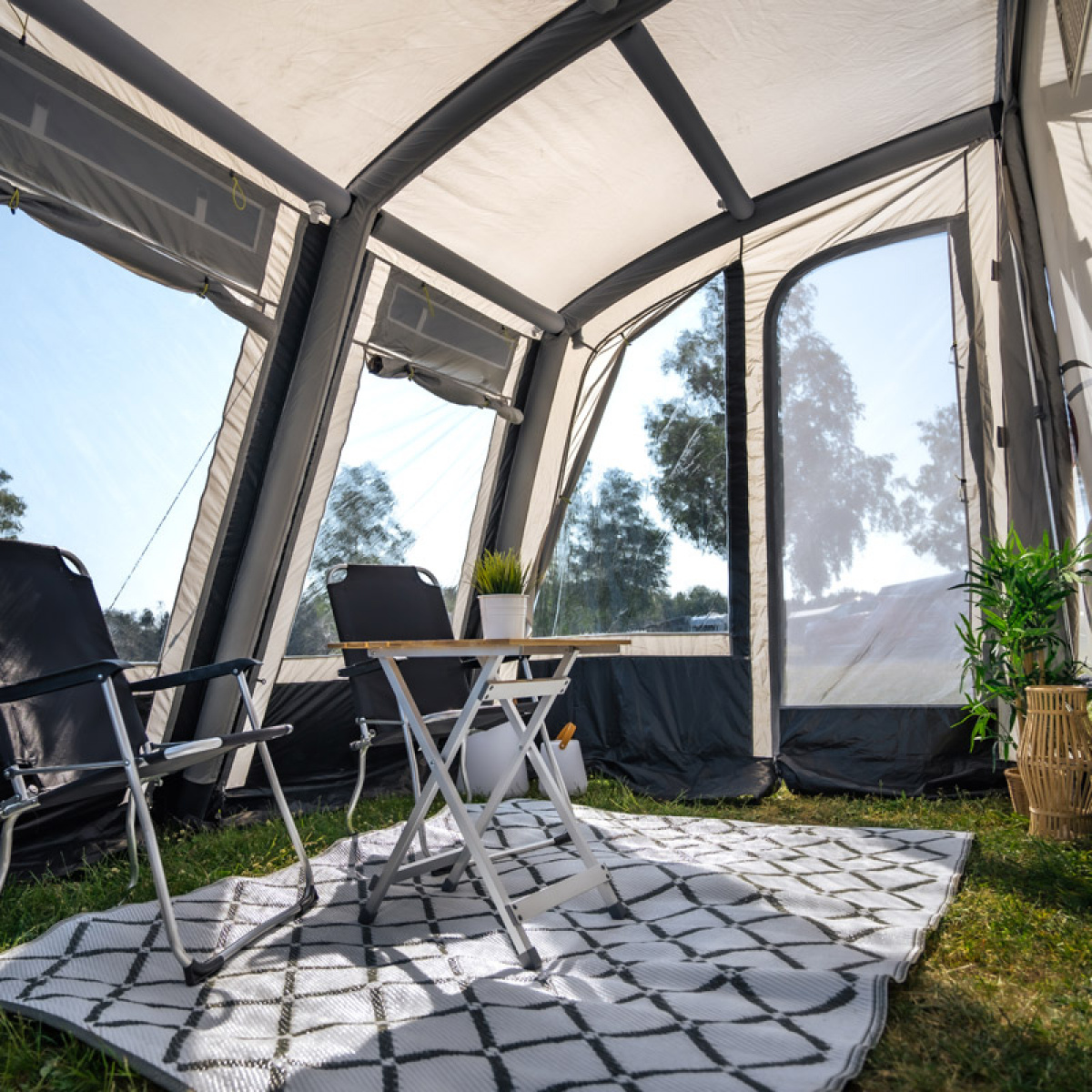 Erittäin edullinen ilmateltta kahdella uranauhalla jonka vuoksi teltta sopii sekä matkailuautolle että matkailuvaunulle.